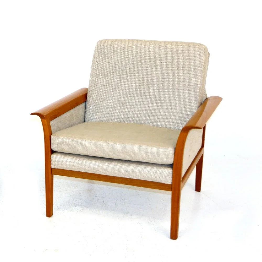 An original lounge chair designed by Fredrik Kayser for Vatne Mobler, Norway, 1950s. Original cream fabric and curved teak arms give this chair a cool comfortable look. Perfect chair to curl up with a good book! 76cms wide 81 deep 76 high - seat height 42cms.