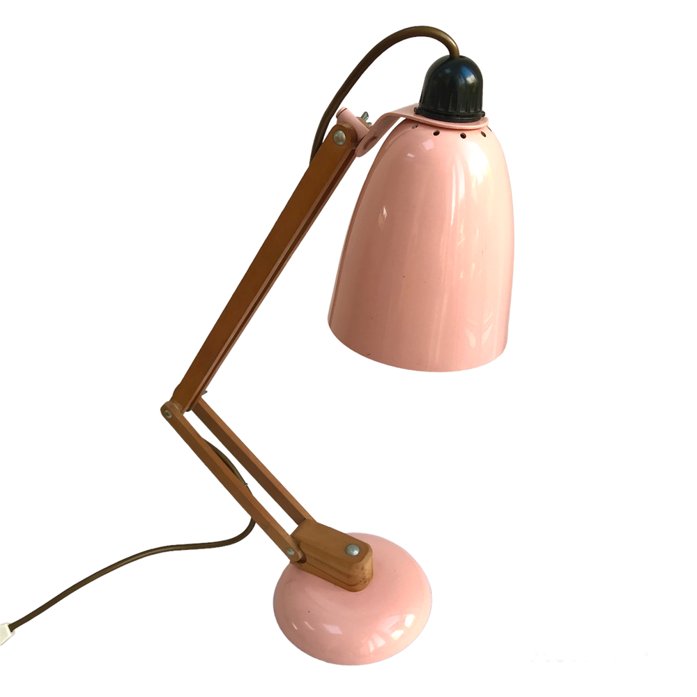 A classic mid-century MacLamp designed by Terence Conran and sold through Habitat. This is an early example with wooden arms and a pink colourway shade and weighted base.